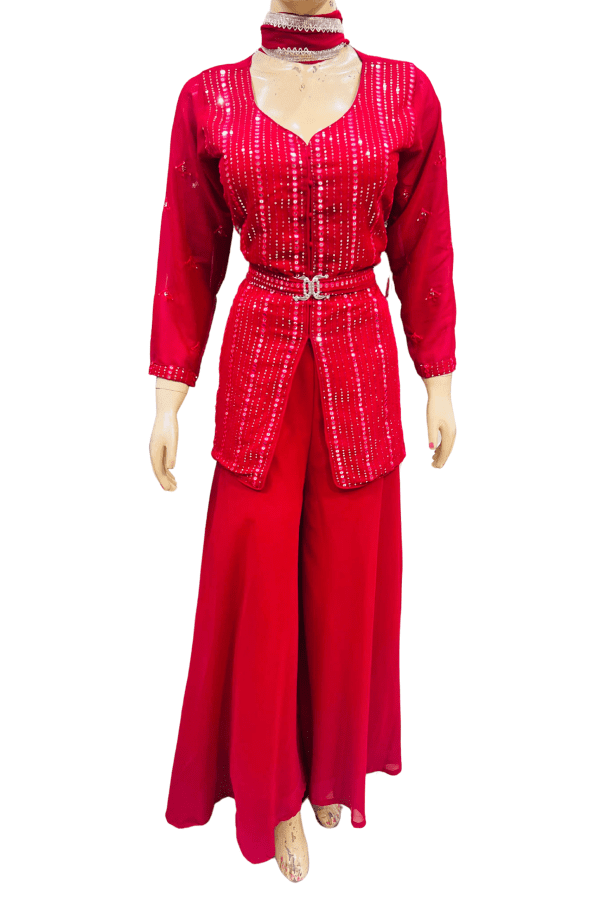 - Material: Chiffon kurta with matching palazzo and dupatta