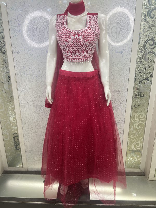 • Embroidery: Thread and hand work throughout the lehenga and dupatta, with detailed embellishments on the choli.