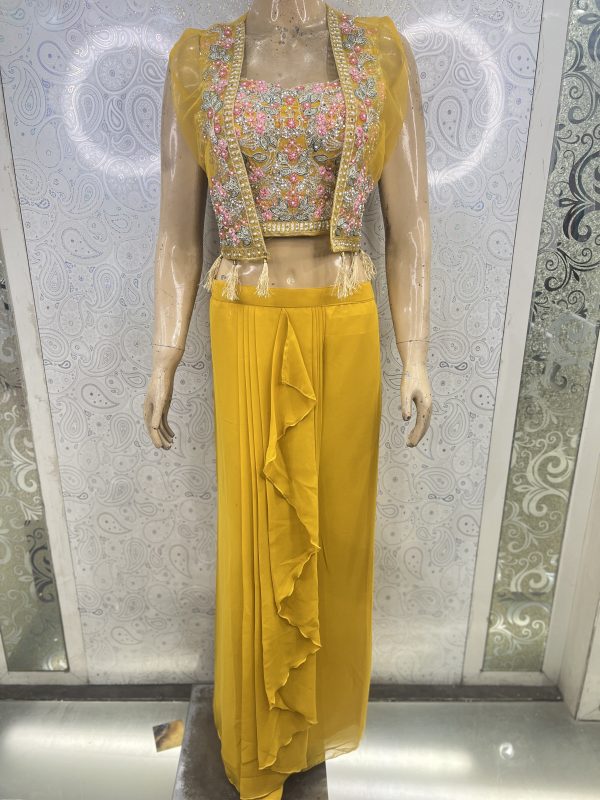 - Design: Intricate thread and hand embroidery in floral patterns with a dhoti design