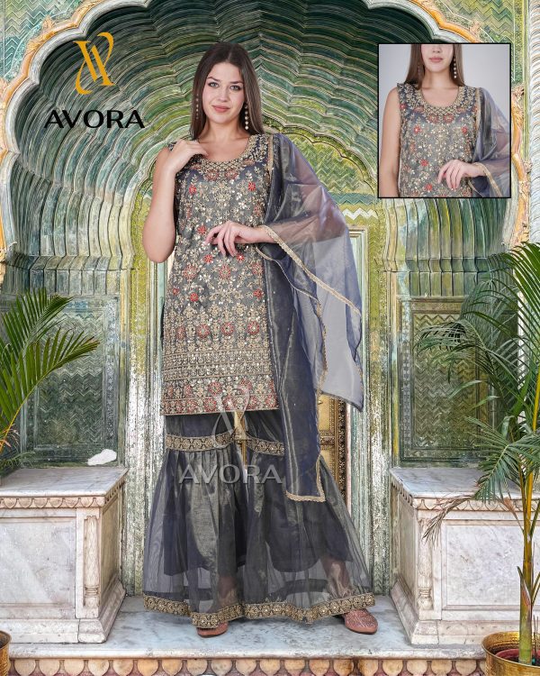 Design Detail: Embrace sophistication with the Blossom Embroidered Suit, featuring intricate thread and sequin floral embroidery, a v-shaped neck, and extra sleeves. The set includes palazzo pants for a timeless appeal.