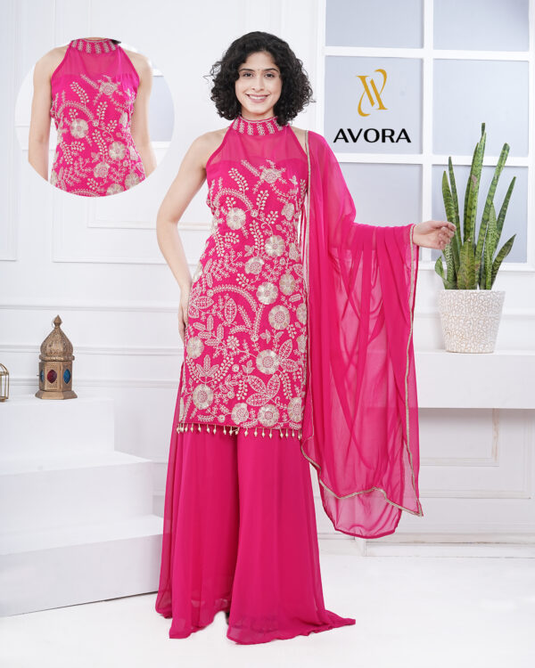 Design Detail: Embrace sophistication with the Blossom Embroidered Suit, featuring intricate thread and mirror embroidery, a v-shaped neck, and extra sleeves. The set includes palazzo pants for a timeless appeal.