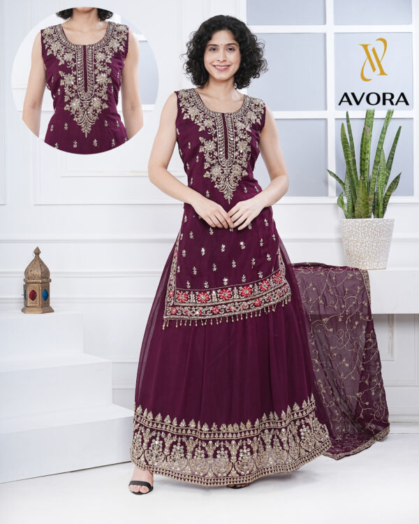 Design Detail: This georgette lehenga set includes a fully embroidered crop top, an elaborately decorated skirt, and a matching sheer dupatta. With delicate floral motifs and intricate detailing, the ensemble offers a perfect blend of modern elegance and traditional craftsmanship.